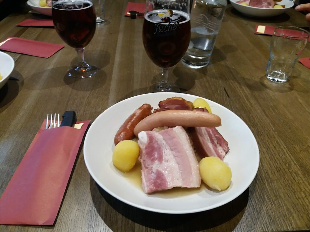 Au menu : choucroute arrosée d’un demi d’une bonne bière d’Alsace et kougelhopf glacé pour le dessert. Prix du repas: 32,20€ par personne. La météo s’était fortement améliorée au cours de la journée. Il ne pleuvait plus et après la visite de Colmar, nous décidons de rejoindre le parking à pied.
