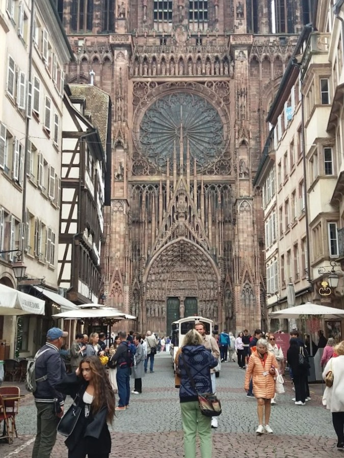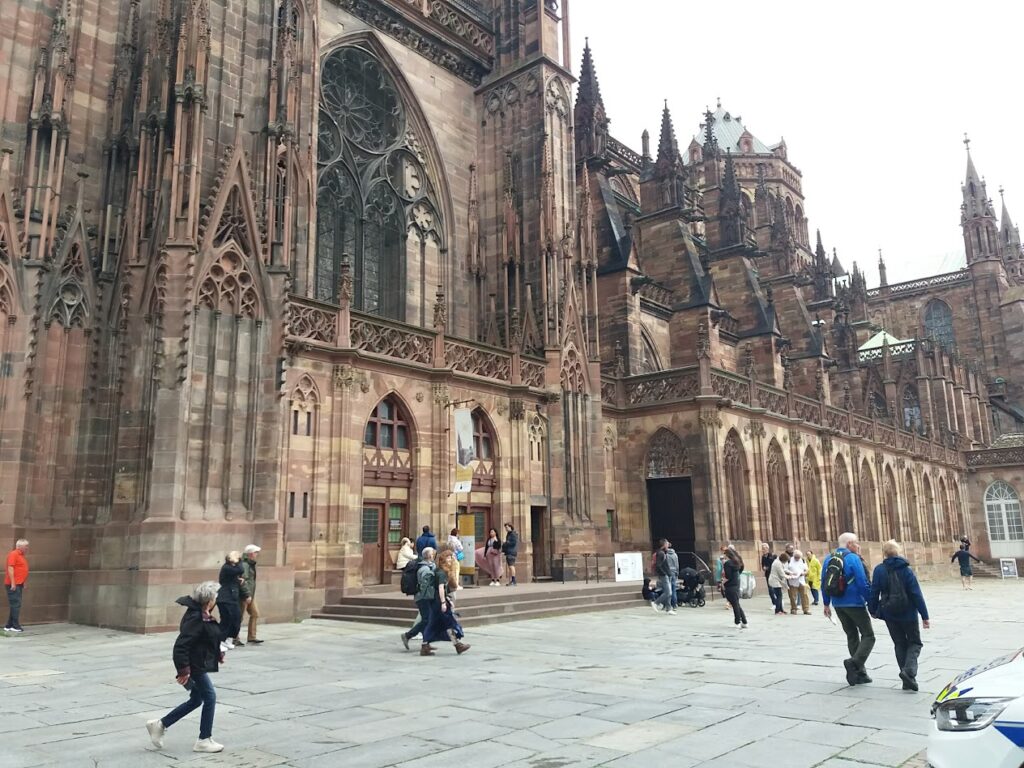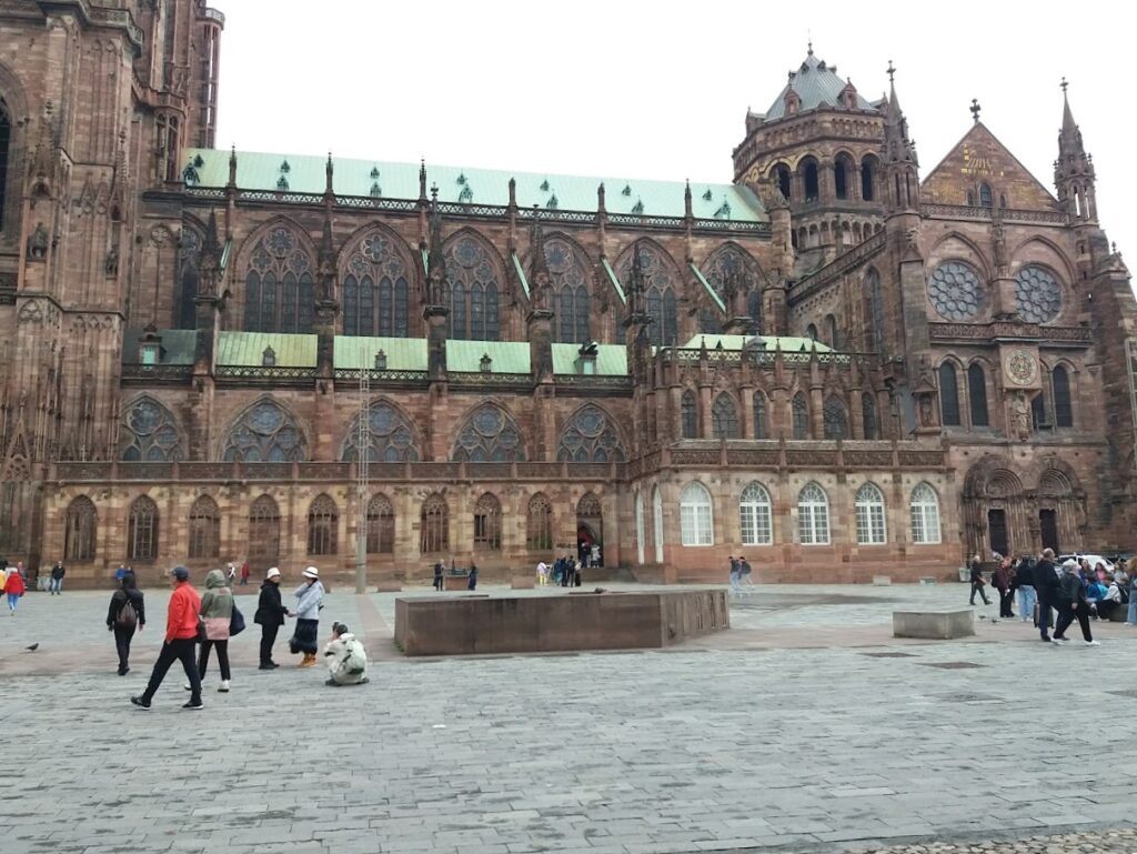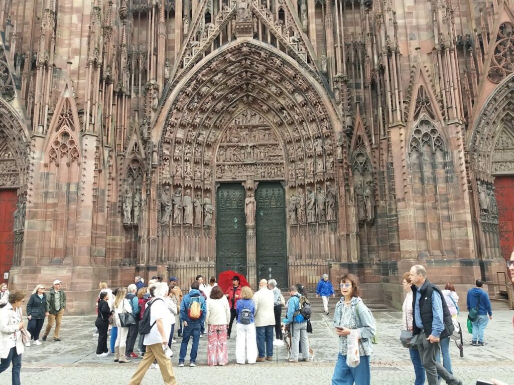 Nous partons en direction du centre historique de Strasbourg en passant par la place Kléberg. Devant les Galeries Lafayette, le contingent féminin de notre expédition n’a pas pu résister à l’attrait de ce grand magasin emblématique que nous avons donc dû visiter. Arrivés à la Grand’rue, nous avons emprunté, à droite, la rue Gutenberg pour rejoindre la place du même nom. Gutenberg inventeur de l’imprimerie n’est pas né à Strasbourg, mais c’est à Strasbourg qu’il a développé cette technique au 15è siècle. Ensuite, nous rejoignons la place de la Cathédrale.