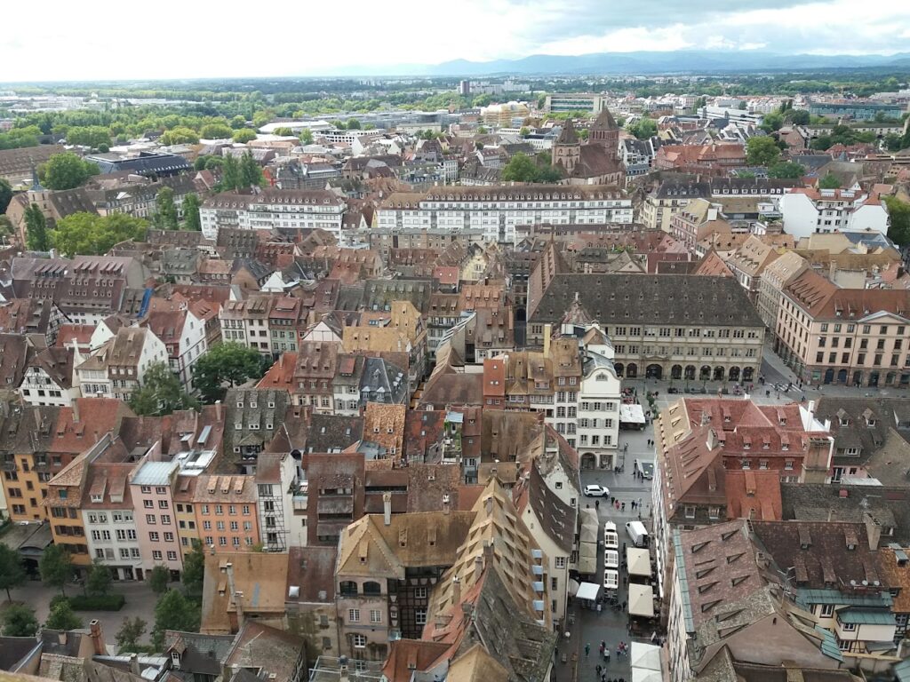 L’intérieur de la cathédrale est grandiose et les vitraux sont magnifiques. Depuis l’extérieur, nous avons la possibilité d’accéder à la plate-forme de la cathédrale. Tarif :8,00€. Francis et Pierre, les plus alertes de l’équipe décident la montée des 325 marches pour accéder à la plate-forme par un escalier en colimaçon. La plate-forme est située à une hauteur de 66m et elle nous dévoile un panorama à 360° sur la ville de Strasbourg. Nous redescendons par un deuxième escalier identique situé à l’opposé du premier. Nous continuons ensuite la visite de Strasbourg en rejoignant « la Petite France ».