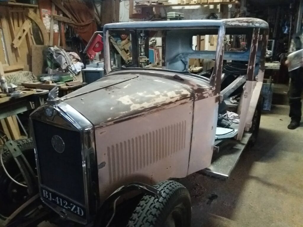 Notre aire d’étape pour cette fin de journée va se situer à Shrirrhein (étape France passion) non pas dans un domaine viticole ou une ferme, mais chez un particulier passionné de mécanique (ancien dépanneur) qui possède un petit jardin et le mets à disposition des camping-caristes. Il faut dire qu’il est lui-même camping-cariste. Juste avant de repartir, le matin, il a été fier de nous montrer la restauration d’une MATHIS de 1928 (réfection des longerons de portière).
