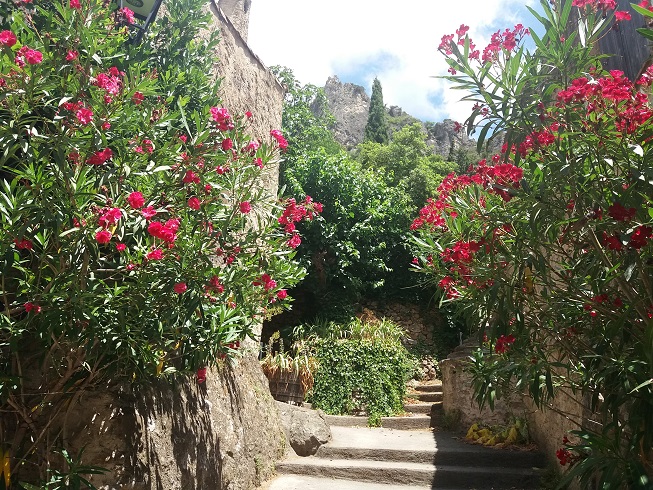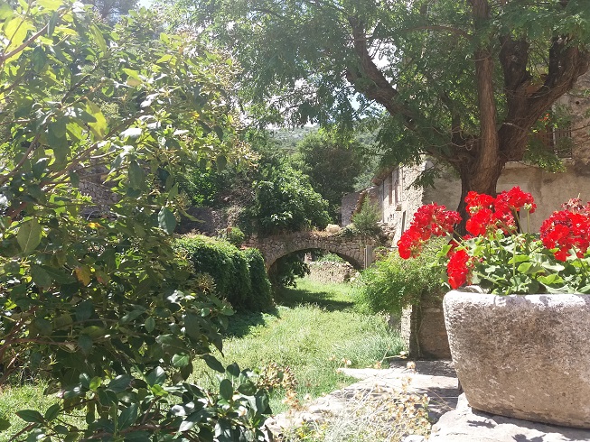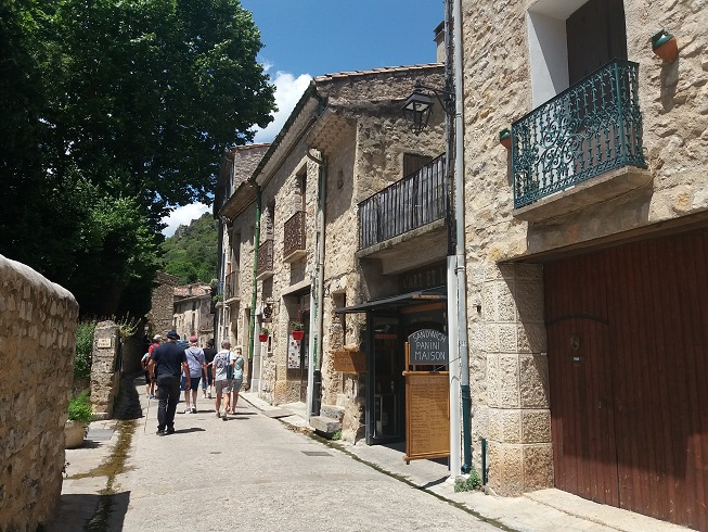 Et s’il est compliqué de stationner pour une voiture, cela l’est encore plus pour un camping-car. N’envisageant pas de faire 8 km à pied depuis le parking du pont du Diable sous une température avoisinant les 30° à l’ombre, nous tentons de nous approcher avec un seul camping-car (en l’occurrence notre ami Chausson) et nous avons la chance de trouver un petit emplacement en retrait de la route et situé à 1 km du village car il est interdit, et même impossible de stationner juste en bordure de route. Saint-Guilhem-le-Désert vaut le détours. Nous avons flâné dans les ruelles pavées de la petite cité médiévale et admiré chacune des façades fleuries qui jalonnaient notre parcours.