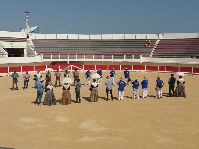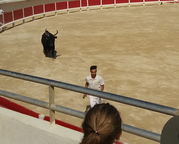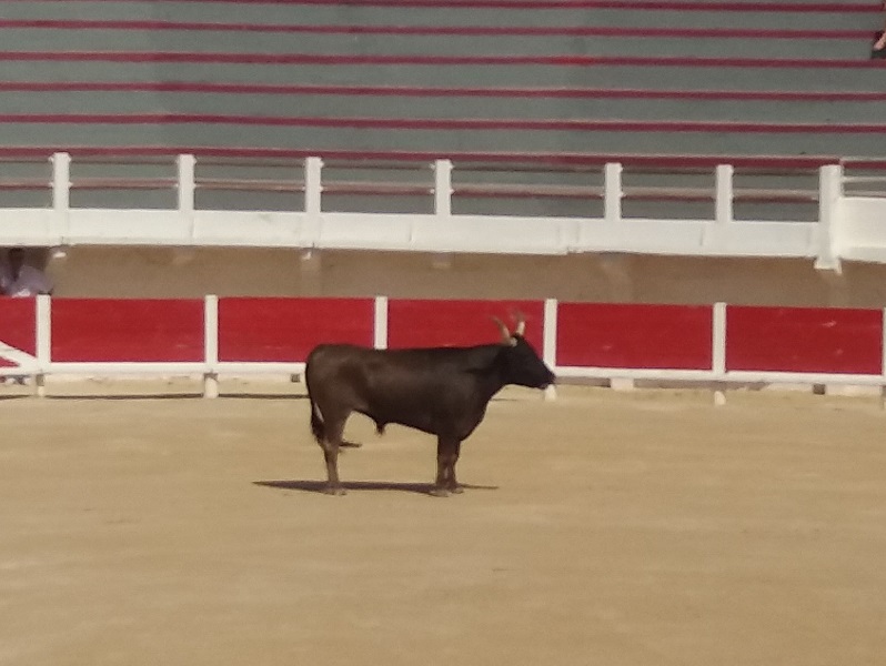 L’après-midi, nous atteignons Les Saintes-Maries-de-la-Mer où nous avons la chance de trouver un parking gratuit réservé aux camping-cars pas trop loin du centre-ville. Ce jour là, une course camarguaise a lieu dans les arènes de la ville à 16h30. Nous décidons d’y assister (Entrée générale; 8,00 €). Environ deux heures de spectacle pour le concours de 7 manades Taureaux jeunes.