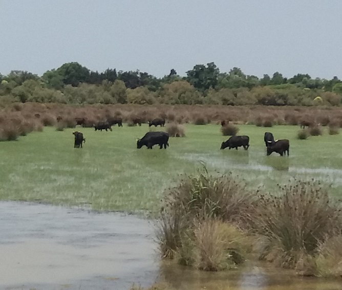 A 14h00, nous prenons le petit train de Méjanes pour une promenade d’environ 45 mn. Notre chauffeur-guide nous fait une description détaillée du paysage qui se dévoile peu à peu sous nos yeux. En longeant l’étang de Vacarès qui se découvre sur notre gauche, nous pouvons voir évoluer en vol les différentes espèces emblématiques de la Camargue, flamands roses, hérons, aigrettes, et nous apercevons tout au long du parcours les troupeaux de taureaux camarguais.