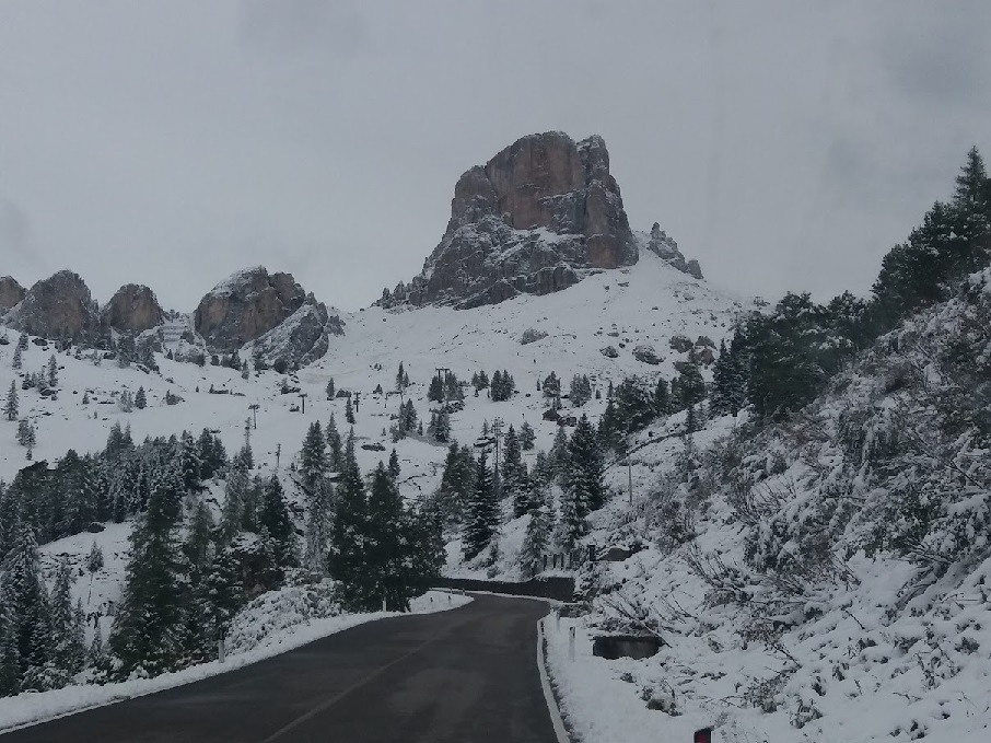 Notre aire d’étape à la fin de cette journée, à Padola, était constituée d’emplacements avantageux sur pavés végétalisés parfaitement horizontaux. Aire récente et parfaitement aménagée. Prix du stationnement (avec services): 20€. Nous avons entendu tomber la pluie toute la nuit et le lendemain matin le remplissage et la vidange des camping-cars s’est faite sous une pluie battante. Nous reprenons la route en passant par Cortina d’Ampezzo et atteignons le col de Falzarego (2050m). Nous avions l’intention de faire une halte en haut du col, mais la neige est venue jouer les trouble-fêtes, si bien que nous avons franchi le col et nous nous sommes empressés de redescendre de l’autre côté pour retrouver la pluie qui nous a accompagné jusque dans la vallée et qui nous a contraint à nous arrêter sur une aire à Valcozzena. Il est 15h30 et la pluie ne s’arrête pas. Inutile de continuer notre route dans ces conditions. Nous décidons de rester sur place et nous tapons une petite belote pour passer le temps. Le tarif du stationnement n’est pas trop élevé: 6,00 €.