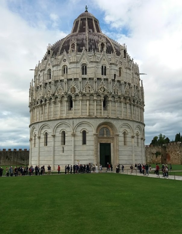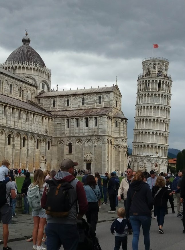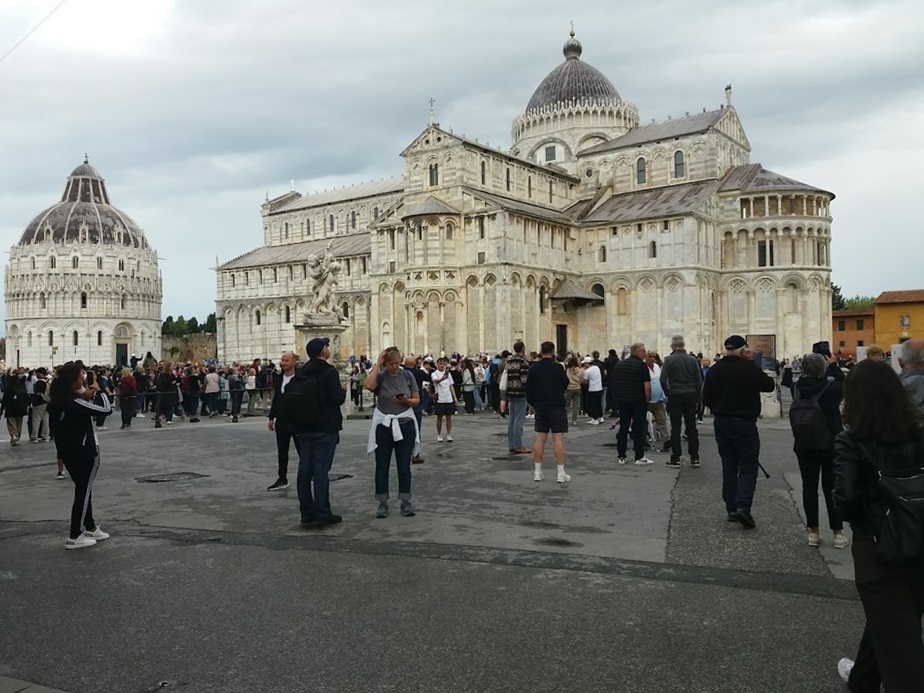 Ce mercredi 18 septembre, nous prenons le bus dont l’arrêt est juste devant l’aire de C-C. Il nous arrête à environ 850 m de la tour de Pise. Lorsque la tour apparait, nous constatons immédiatement son inclinaison. C’est cette inclinaison qui l’a rendu célèbre dans le monde entier. Elle est l’un des symbole de l’Italie comme la tour Eiffel est le symbole de la ville de Paris. Le spectacle est tout de même impressionnant.