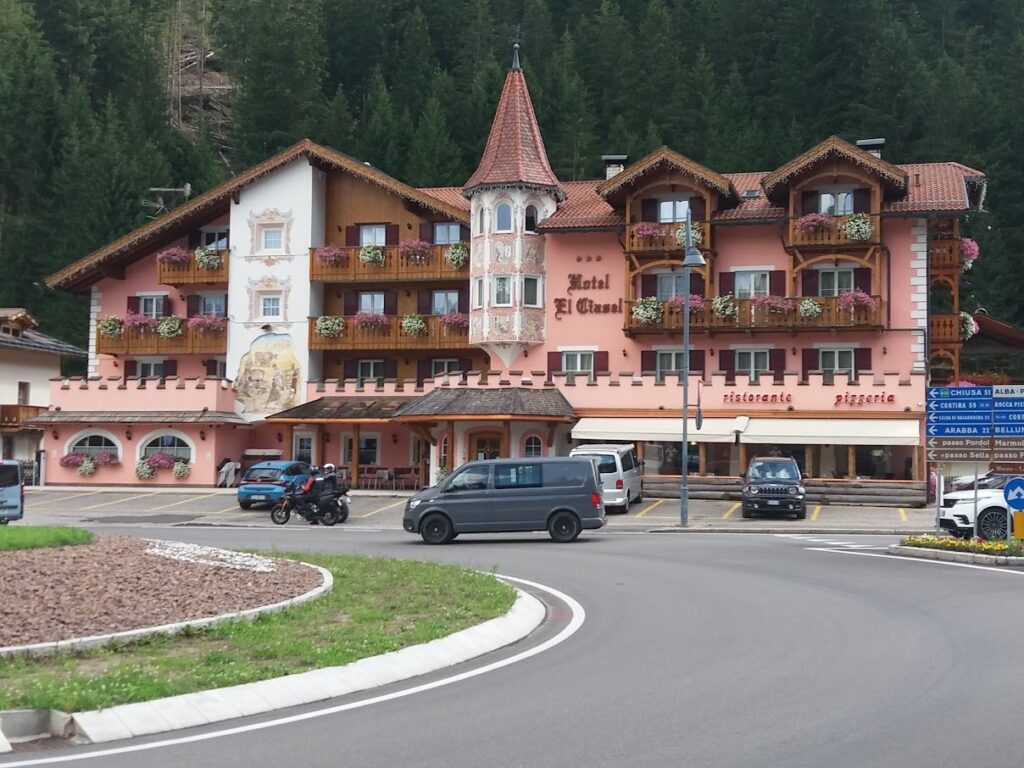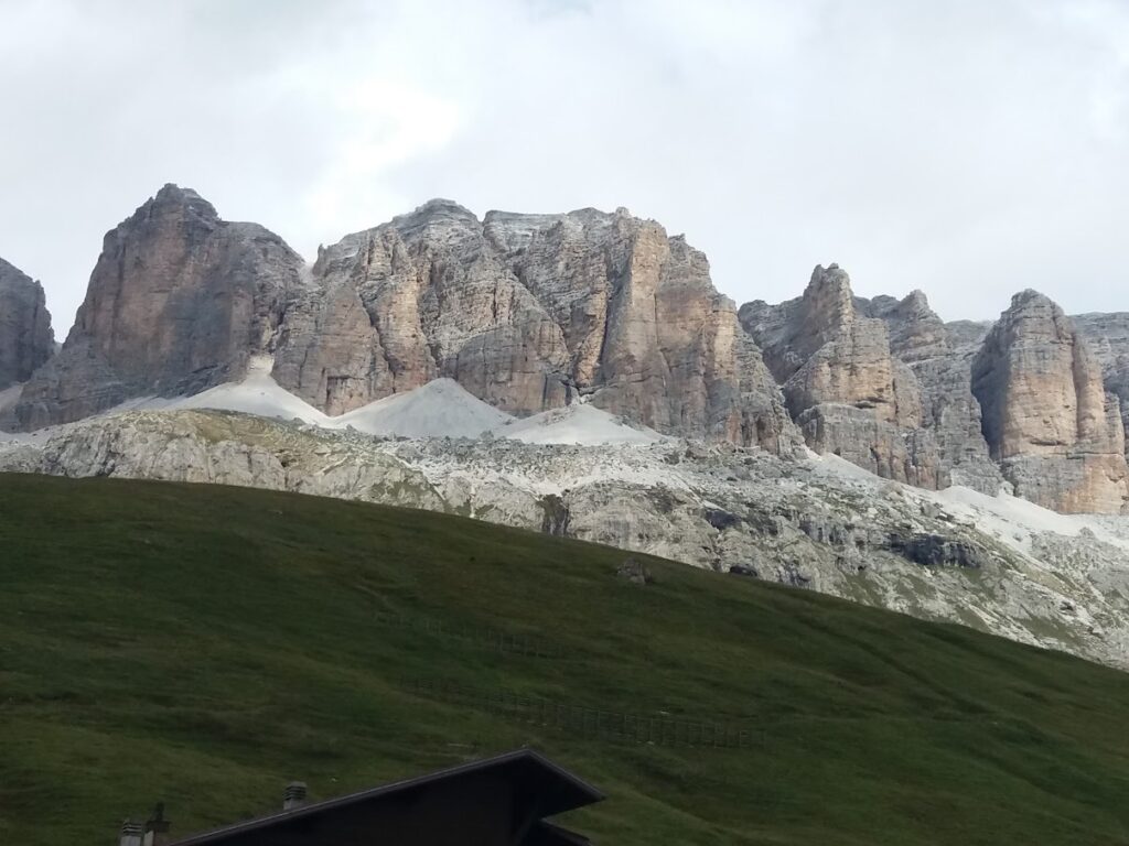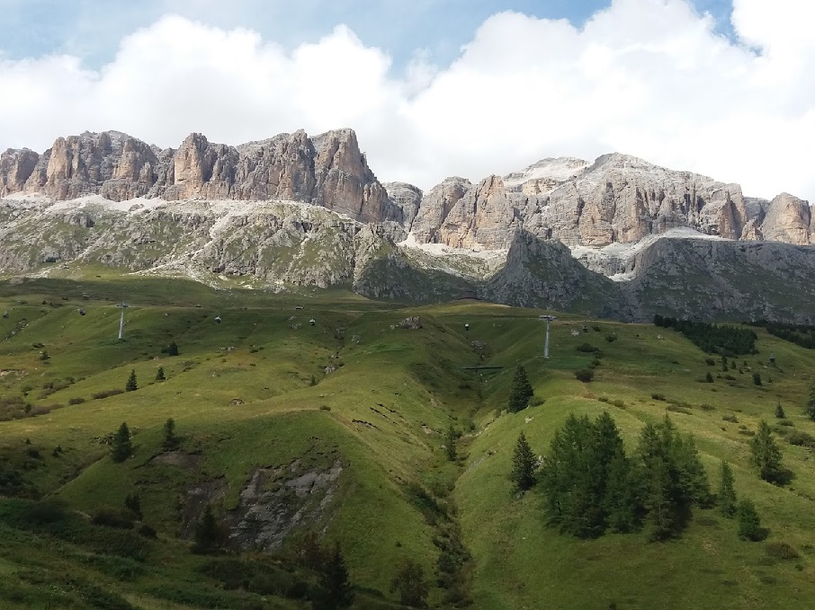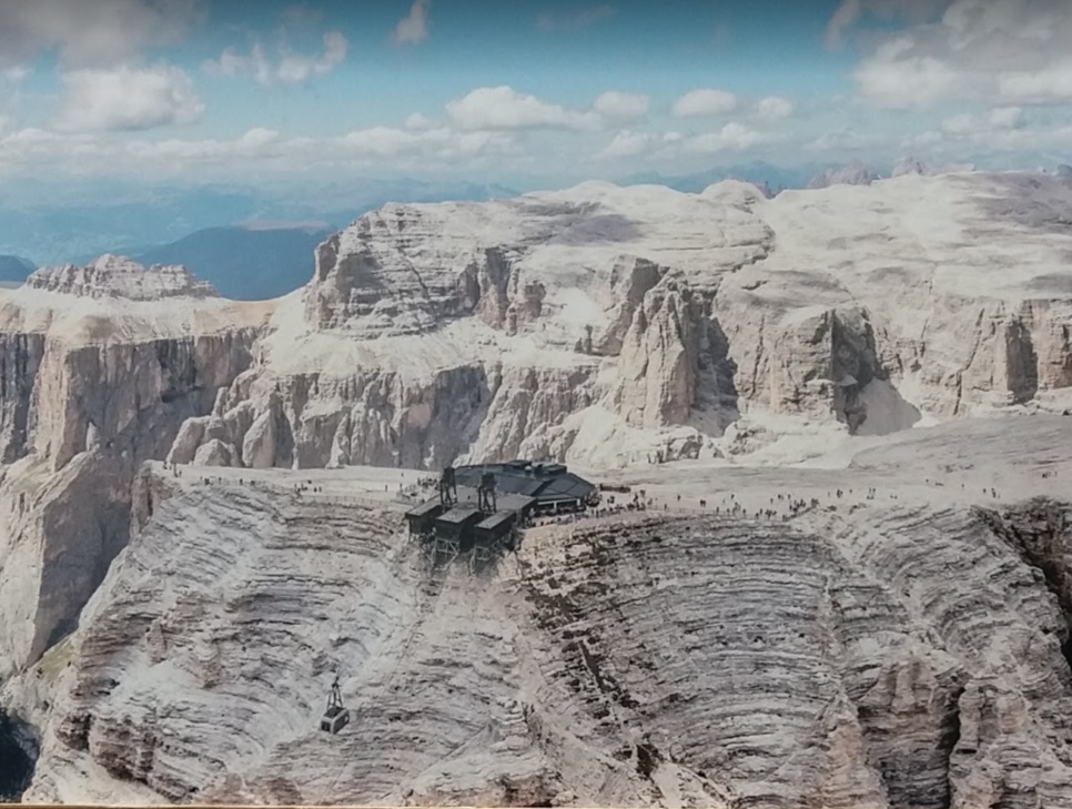 Le mercredi, nous entamons la traversée du massif en passant par Moena, Canazei, Passo Pordoi (col situé à 2249m d’altitude). La température est de 7°. Le panorama est magnifique. Depuis le col, un téléphérique transporte ceux qui l’empruntent sur un plateau situé 2950m nommé « La terrasse des Dolomites » et qui accueille également un restaurant. Le ciel était partiellement ensoleillé et assez nuageux.