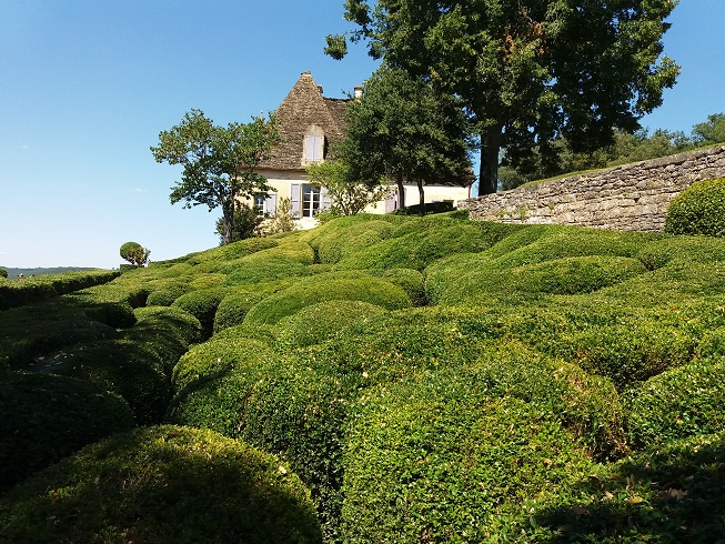 Puis nous arrivons à Vézac où nous faisons notre dernière halte pour la journée pour aller visiter « Les jardins de Marqueyssac ». Prix de la visite 9,90 €. Ce jardin se caractérise par ses milliers de buis taillés à la main. Les jardins romantiques et pittoresques de Marqueyssac offrent plus de 6 Km de promenades. Le site dispose d’un belvédère qui offre l’un des plus impressionnants panoramas du Périgord sur la vallée de la Dordogne et ses châteaux.