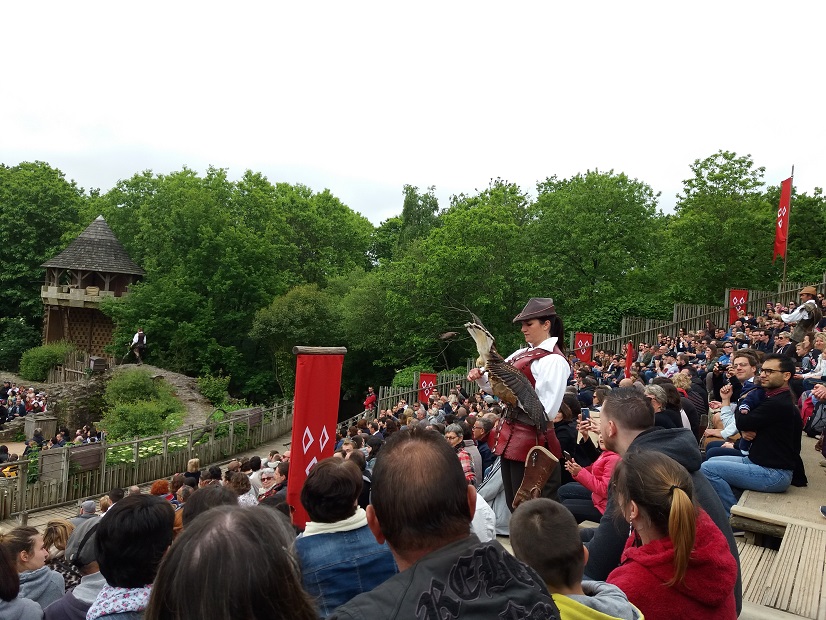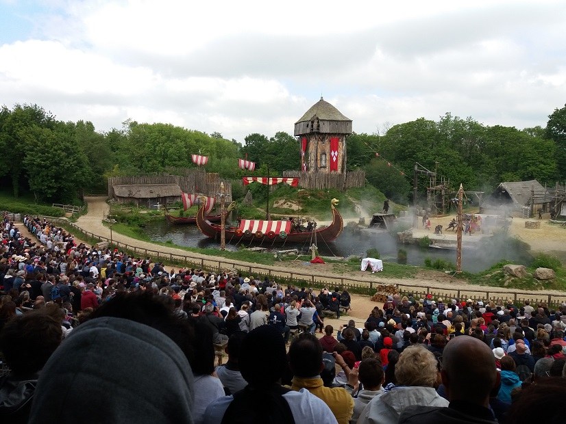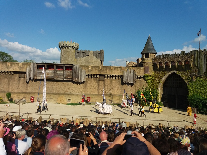 Notre aire d’étape ce jour là est le parking de 600 places du Puy du Fou où une partie est entièrement réservée aux C-C. Le parking est gratuit dans la journée et payant la nuit pour les camping-cars (10 € la nuit). Le prix des services est de 2 € (remplissage d’eau: 10 mn). Dès le lendemain, nous accédons au Parc d’attractions. Le grand parc du Puy du Fou en lui-même, ouvert en 1989, reprend des éléments historiques de l’histoire de la région environnant le Puy du Fou et les adapte pour en faire des spectacles, mettant notamment à profit des animaux dressés (chevaux, rapaces, grands félins) et des effets spéciaux et pyrotechniques.